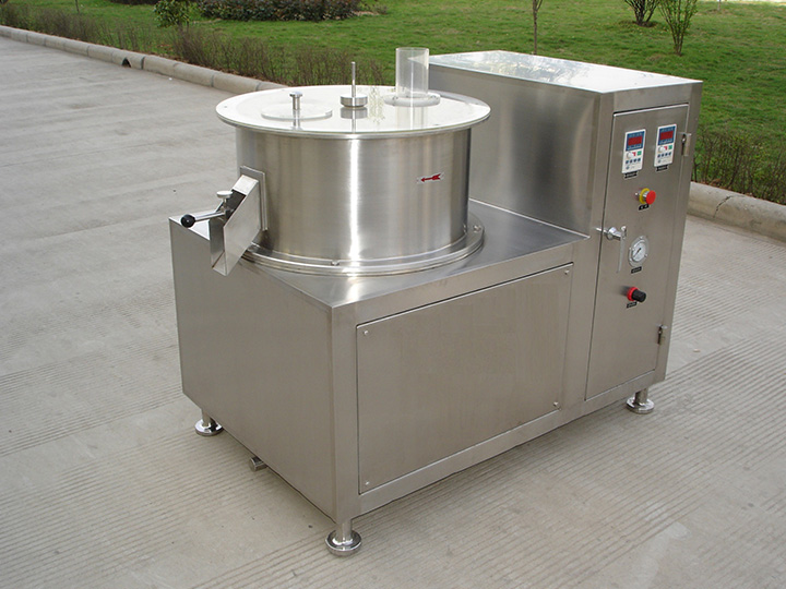 本機通過離心轉(zhuǎn)盤、鼓風機、氣動噴槍,將濕顆粒制成美麗的球丸。將前道工序做成的濕顆粒投入離心轉(zhuǎn)盤內(nèi),啟動鼓風機后再將離心轉(zhuǎn)盤啟動,使顆粒受到環(huán)隙空氣浮力、旋轉(zhuǎn)離心力和自身重力的作用,呈環(huán)周繩股狀運動,從而形成真球度極高的球丸。