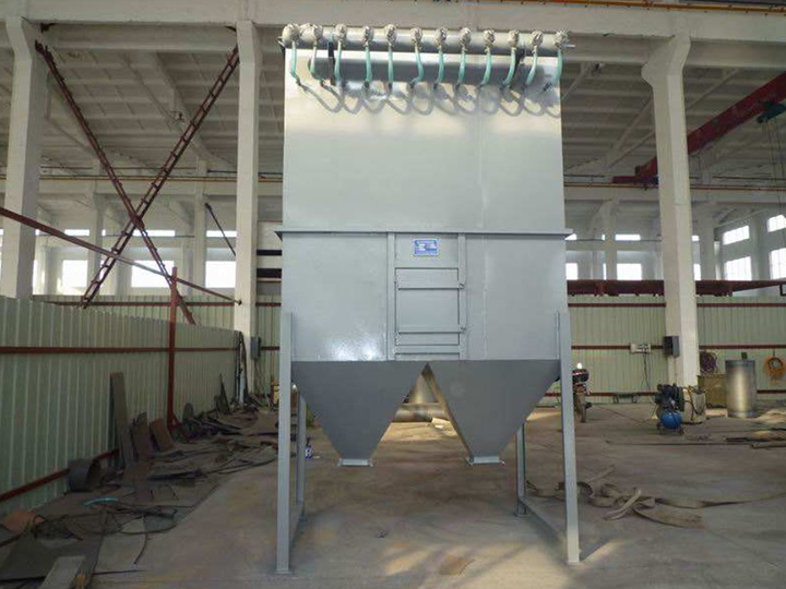 含塵氣流從進(jìn)氣口進(jìn)入下箱體后,粉塵被布袋阻留。凈化后的空氣透過(guò)濾袋,經(jīng)文氏管進(jìn)入上箱體,從出口排出。積附在濾袋外壁的粉塵不斷增加,當(dāng)阻力在規(guī)定范圍內(nèi)(一般為80~120毫米水柱),就要清除積附在濾袋外壁的粉塵。清灰是由控制器按順序觸發(fā)各個(gè)控制閥,氣包內(nèi)的壓縮空氣通過(guò)噴吹管使布袋在一瞬間急速膨脹,伴隨氣流的反作用,抖落的粉塵經(jīng)下料閥排出。